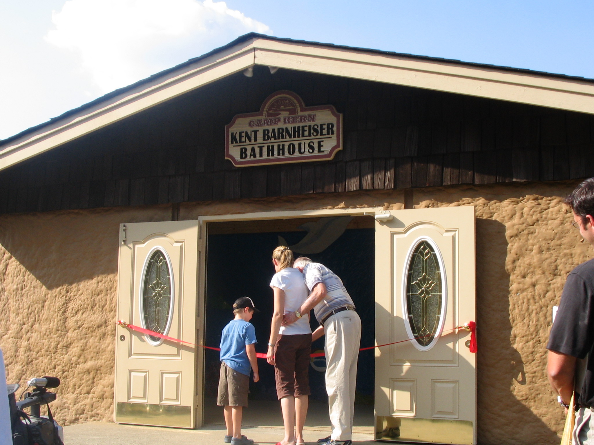 Rhys, Amy and Kent cut the ribbon to dedicate the Kent Barnheiser Bathhouse.